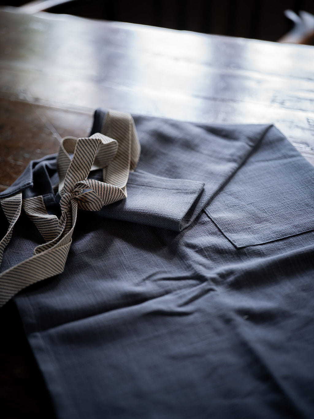 A classic style apron in a beautiful, rich colour with lovely striped ties. This apron is neither too masculine nor too feminine.