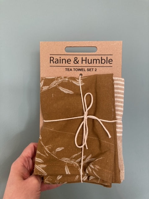 Pair of tea towels. One with a hand drawn olive branch design screen printed using traditional methods; the other with a woven stripe design at one end.