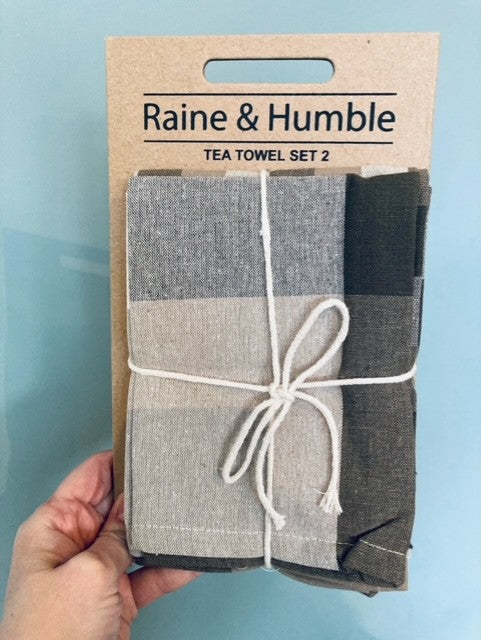 Pair of tea towels. One with a large checkered design; the other with a smaller scale checkered design.