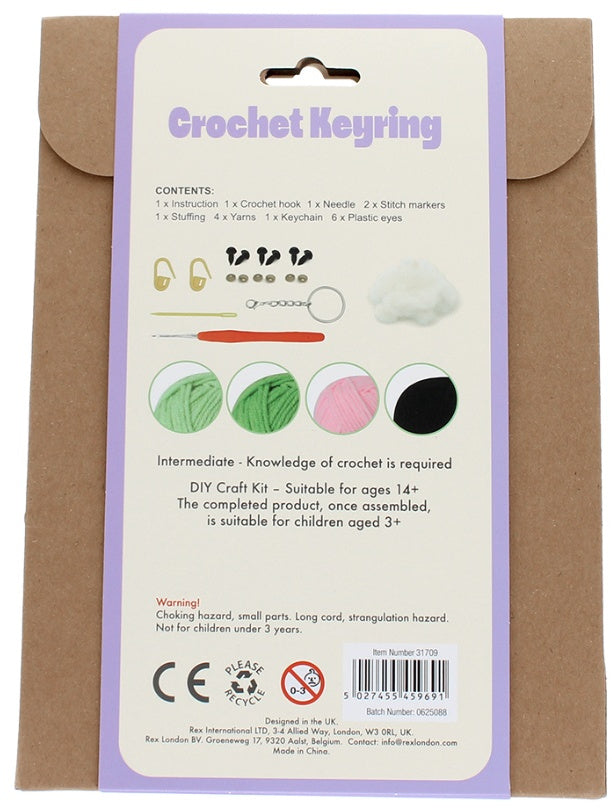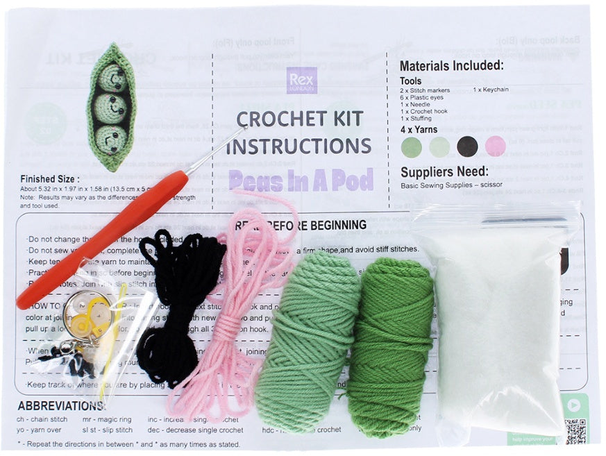 This fun crochet craft kit has everything you need to make a keyring featuring a kawaii trio of peas in a pod.